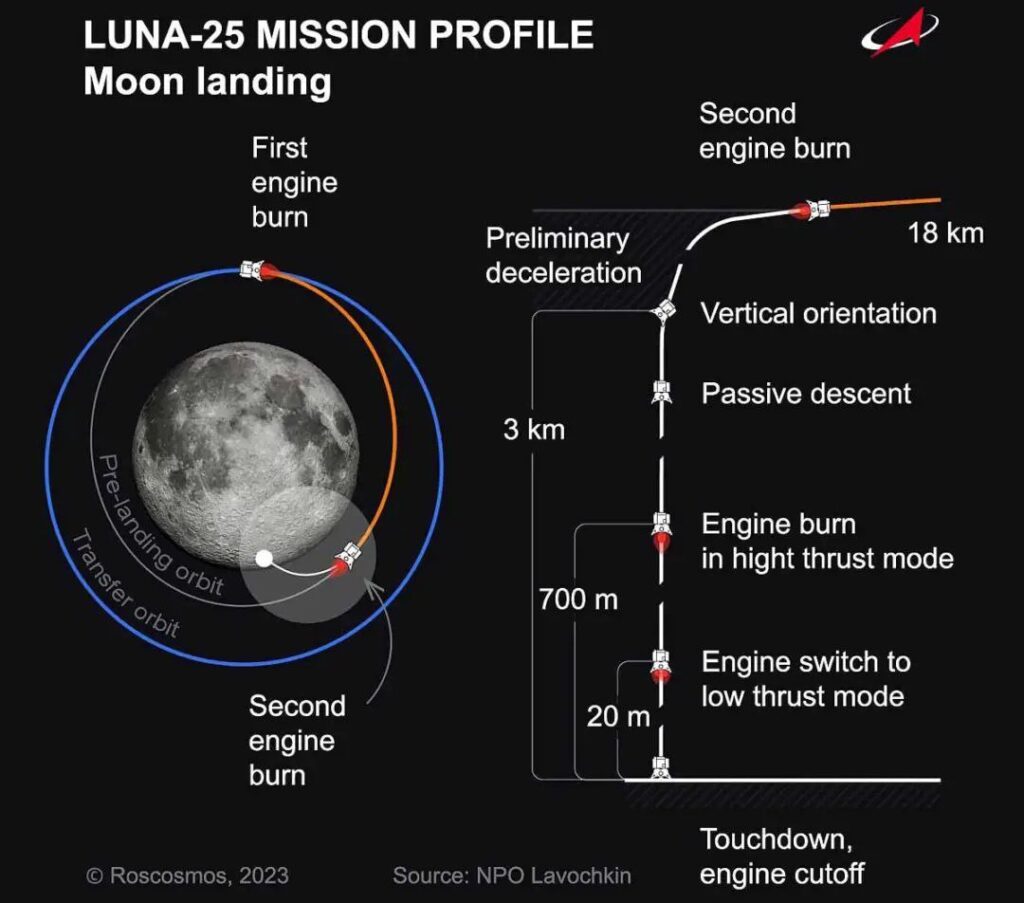 ଚନ୍ଦ୍ରୟାନ-୩ ପୂର୍ବରୁ ଚନ୍ଦ୍ର ରେ ଅବତରଣ କରିପାରେ ଲୁନା-୨୫ସୋୟୁଜ୍ ୨.୧ ବି (ସୋୟୁଜ୍ ୨.୧ ବି) ରକେଟ୍ ସହିତ ଲଞ୍ଚ କରାଯାଇଥିଲା l ଏହାକୁ ଲୁନା-ଗ୍ଲୋବ ମିଶନ ମଧ୍ୟ କୁହାଯାଏ l ଏହି ରକେଟର ଲମ୍ବ ପ୍ରାୟ ୪୬.୩ ମିଟର ଅଟେ l ଏହାର ବ୍ୟାସ ୧୦.୩ ମିଟର ଅଟେ ଓ ଏହାର ଓଜନ ୩୧୩ ଟନ୍ l ଚାରି ପର୍ଯ୍ୟାୟ ରକେଟ୍ ଲୁନା-୨୫ ଲ୍ୟାଣ୍ଡରକୁ ପୃଥିବୀ ବାହାରେ ଏକ ବୃତ୍ତାକାର କକ୍ଷପଥରେ ଉତକ୍ଷେପଣ କରାଯାଇଛି | ଯାହା ପରେ ଏହି ମହାକାଶଯାନ ଚନ୍ଦ୍ରର ରାଜପଥରେ ଚାଲିଗଲା | କେବଳ ଏହି ରାଜପଥରେ ଦିନ ଯାତ୍ରା କରିବ l ଏହା ପରେ, ଏହା ୭-୧୦ ଦିନ ପର୍ଯ୍ୟନ୍ତ ଚନ୍ଦ୍ରରେ ବୁଲିବ l ଲୁନା -୨୫ ଅଗଷ୍ଟ ୨୧ କିମ୍ବା ୨୨ ଅଗଷ୍ଟରେ ଚନ୍ଦ୍ର ପୃଷ୍ଠରେ ଅବତରଣ କରିବ l ଏହାର ଲ୍ୟାଣ୍ଡର୍ ଚନ୍ଦ୍ର ପୃଷ୍ଠରୁ ୧୮ କିଲୋମିଟରରେ ପହଞ୍ଚିବା ପରେ ଅବତରଣ ଆରମ୍ଭ କରିବ ବୋଲି ସୂଚନା ମିଳିଛି l ପ୍ରାୟ ୧୫ କିଲୋମିଟର ଉଚ୍ଚତା ହ୍ରାସ କରିବା ପରେ, ୩ କିଲୋମିଟର ଉଚ୍ଚତାରୁ ଏକ ନିଷ୍କ୍ରିୟ ଅବତରଣ ହେବ l ଅର୍ଥାତ୍ ଧୀରେ ଧୀରେ ଲୁନା -୨୫ ଚନ୍ଦ୍ର ପୃଷ୍ଠରେ ଅବତରଣ କରିବ l ୭୦୦ ମିଟର ଉଚ୍ଚତାରୁ, ଥ୍ରଷ୍ଟରଗୁଡିକ ଏହାର ଗତି ମନ୍ଥର କରିବାକୁ ଦ୍ରୁତ ଗତିରେ ରହିବ l