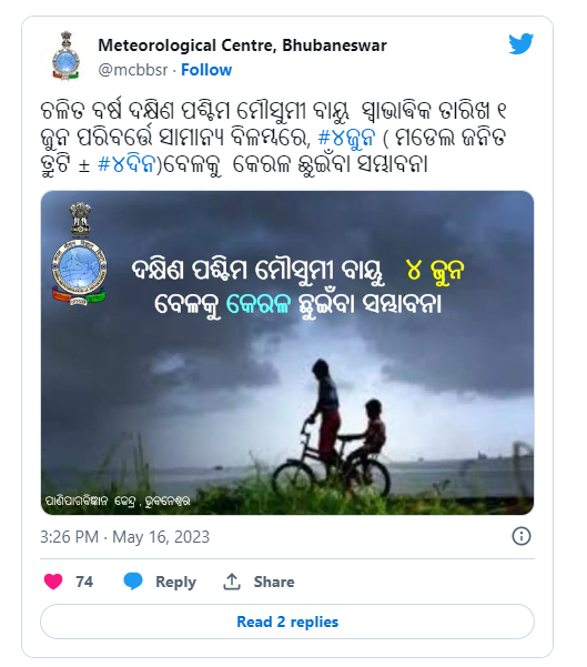 କେରଳ ଉପକୂଳରେ ସାଧାରଣତଃ ଜୁନ ୧ ତାରିଖରେ ମୌସୁମୀ ବାୟୁ ପ୍ରବେଶ କରିଥାଏ। କିଛି ସମୟରେ ଏଥିରେ ସାମାନ୍ୟ ବିଳମ୍ବ ଦେଖାଯାଇଥାଏ। କେରଳ ପହଞ୍ଚିବାର ଗୋଟେ ସପ୍ତାହ ପରେ ମୌସୁମୀ ବାୟୁ ଓଡ଼ିଶାକୁ ଆସିଥାଏ। ତେବେ ଚଳିତ ବର୍ଷ ଜୁନ ମାସ ଦ୍ଵିତୀୟ ସପ୍ତାହରେ ମୌସୁମୀ ବାୟୁ ଓଡ଼ିଶାରେ ପ୍ରବେଶ କରିବାର ସମ୍ଭାବନା ରହିଛି।