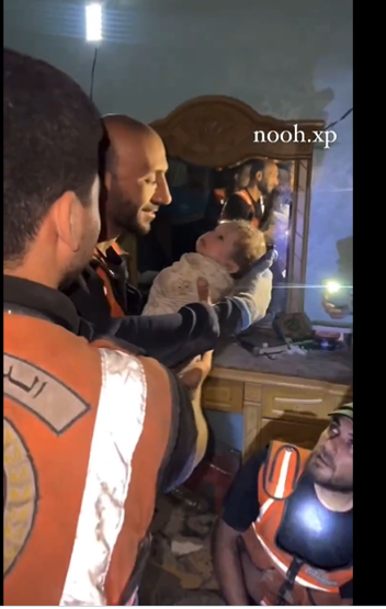 ଗଲ୍ଫ ନ୍ୟୁଜ୍ ରିପୋର୍ଟ ଅନୁଯାୟୀ, ଧ୍ୱଂସାବିଶେଷ ତଳେ ଜୀବନ୍ତ ଥିବା ନବଜାତ ଶିଶୁ ଇସ୍ରାଏଲ୍-ହାମାସ୍ ଯୁଦ୍ଧ ଆରମ୍ଭ ହେବାର କିଛି ଦିନ ପୂର୍ବରୁ ଜନ୍ମ ହୋଇଥିଲା । ଯୁଦ୍ଧ ଆରମ୍ଭ ହେବା ମାତ୍ରେ ଇସ୍ରାଏଲ୍ ଗାଜା ପଟ୍ଟି ଉପରେ ବୋମା ପକାଇବା ଆରମ୍ଭ କଲା । ଯେଉଁଥିରେ ଅନେକ ଘର ନଷ୍ଟ ହୋଇଯାଇଥିଲା, ସବୁ ସ୍ଥାନରେ ମୃତଦେହ ଗଦା ହୋଇ ରହିଥିଲା । ଡାକ୍ତରଖାନାରେ ମୃତଦେହ ରଖିବା ପାଇଁ ଜାଗା ନଥିଲା । ଅଧିକାଂଶ ସହର ଧ୍ୱଂସାବଶେଷରେ ପରିଣତ ହୋଇଥିଲା । ଏହି ନିରୀହ ଶିଶୁ ଟି ର ମଧ୍ୟ ସେହି ନଷ୍ଟ ହୋଇଥିବା ଘରଗୁଡ଼ିକ ମଧ୍ୟରେ ଗୋଟିଏ ଘର ଥିଲା ।