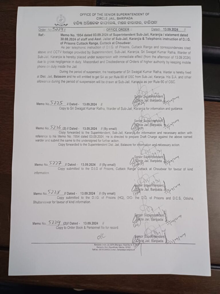 ଆଜିକାଲି ସମସ୍ତେ ମୋବାଇଲ ନିଶାରେ ବାୟା । ଅନ୍ ଡ୍ୟୁଟି ଥିବା ବେଳେ ଜେଲରେ ମୋବାଇଲ ବ୍ୟବହାର କରିବା ପଡ଼ିଲା ମହଙ୍ଗା ।କରଞ୍ଜିଆ ଉପକାରାଗାରରେ ଓ୍ବାର୍ଡର ସ୍ବାଗତ ରଥ ଓ କୃଷ୍ଣଚନ୍ଦ୍ର ମହାନ୍ତି ଉଭୟଙ୍କୁ ସସ୍ପେଣ୍ଡ ସହ ହେଡ୍ କ୍ୱାର୍ଟର୍ସର ପରିବର୍ତ୍ତନ ନିର୍ଦ୍ଦେଶ ଦେଇଛନ୍ତି ବାରିପଦା ସର୍କଲ ଜେଲ ବରିଷ୍ଠ ସୁପରିଣ୍ଟେଣ୍ଡେଣ୍ଟ ।