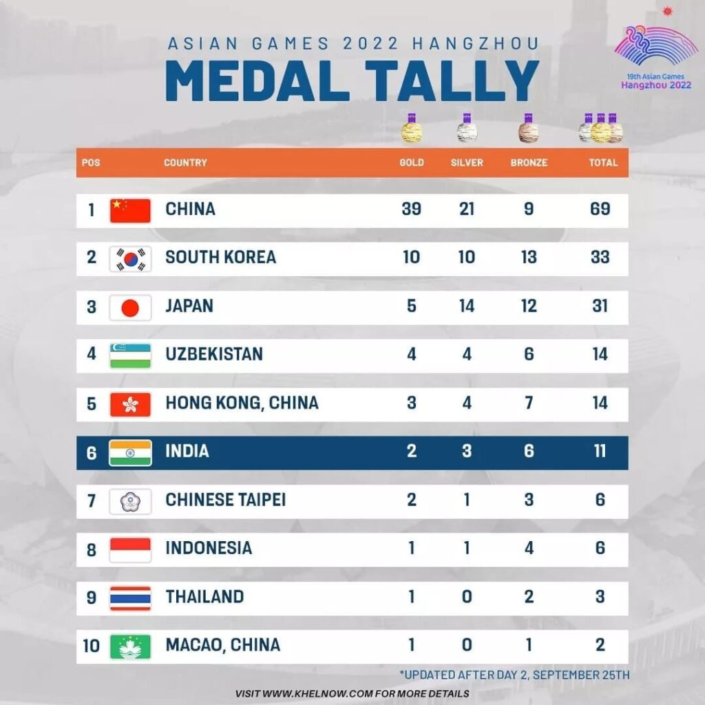 ଏହାପୂର୍ବରୁ ସୋମବାର, ଖେଳର ଦ୍ୱିତୀୟ ଦିନରେ ଭାରତ ଦୁଇଟି ସ୍ୱର୍ଣ୍ଣ ପଦକ ଜିତିଥିଲା। ୧୦ ମିଟର ଏୟାର ରାଇଫଲ ଦଳ ବିଶ୍ୱ ରେକର୍ଡ ସହ ସ୍ୱର୍ଣ୍ଣ ପଦକ ଜିତିଥିବାବେଳେ ଭାରତୀୟ ମହିଳା କ୍ରିକେଟ୍ ଦଳ ପ୍ରଥମ ଥର ପାଇଁ ଶ୍ରୀଲଙ୍କାକୁ ପରାସ୍ତ କରି ସ୍ୱର୍ଣ୍ଣ ପଦକ ଜିତିଛି। ରୋଇଂରେ (ପୁରୁଷ 4), ଜସବିନ୍ଦର, ଭୀମ, ପୁଣେ ଏବଂ ଆଶିଷ 6: 10.81 ସମୟ ସହ ବ୍ରୋଞ୍ଜ ପଦକ ଜିତିଥିଲେ l ୨୫ ମିଟର ଦ୍ରୁତ ଅଗ୍ନି ପିସ୍ତଲ ଦଳ ଇଭେଣ୍ଟରେ ଅନିଶ, ବିଜୟଭୀର ଏବଂ ଆଦର୍ଶ ତ୍ରିରଙ୍ଗା ବ୍ରୋଞ୍ଜ ପଦକ ଜିତିଥିଲେ। ଏହା ବ୍ୟତୀତ ବଲରାଜ ପାନୱାର ପୁରୁଷ ଏକକ ସ୍କଲ୍ସ ଇଭେଣ୍ଟ ଫାଇନାଲରେ ପହଞ୍ଚିଛନ୍ତି। ସେ ପଦକ ପାଇଁ ଦୌଡ଼ରେ ଅଛନ୍ତି l ନେମାନ ୱାଙ୍ଗସୁ ୱଶୁରେ ପଦକ ପ୍ରତିଯୋଗୀ ହେବେ। ଶୁଟିଂରେ ରୁଦ୍ରାନ୍ଶ, ଐଶ୍ୱର୍ଯ୍ୟା ଏବଂ ଦିବ୍ୟଙ୍କ ତ୍ରିକୋଣୀୟ ୧୦୦ ମିଟର ଏୟାର ରାଇଫଲ ଦଳ ଇଭେଣ୍ଟରେ 1893.7 ସ୍କୋର ସହିତ ସ୍ୱର୍ଣ୍ଣ ପଦକ ଜିତିଥିଲେ। ଏହି ତ୍ରିକୋଣ ମଧ୍ୟ ଏହି ଇଭେଣ୍ଟରେ ଏକ ନୂତନ ବିଶ୍ୱ ରେକର୍ଡ ସୃଷ୍ଟି କରିଛି l ଏସିଆନ୍ ଗେମ୍ସ ୨୦୨୨ ର ପଦକ ସାରଣୀରେ ୧୧ ଟି ପଦକ ସହିତ ଭାରତ ଷଷ୍ଠ ସ୍ଥାନରେ ରହିଛି l ଦ୍ୱିତୀୟ ଦିନ ଶେଷ ସୁଦ୍ଧା ଭାରତରେ କିଟିରେ ଦୁଇଟି ସ୍ୱର୍ଣ୍ଣ ପଦକ, ତିନୋଟି ରୌପ୍ୟ ପଦକ ଏବଂ ୬ ଟି ବ୍ରୋଞ୍ଜ ରହିଛି।